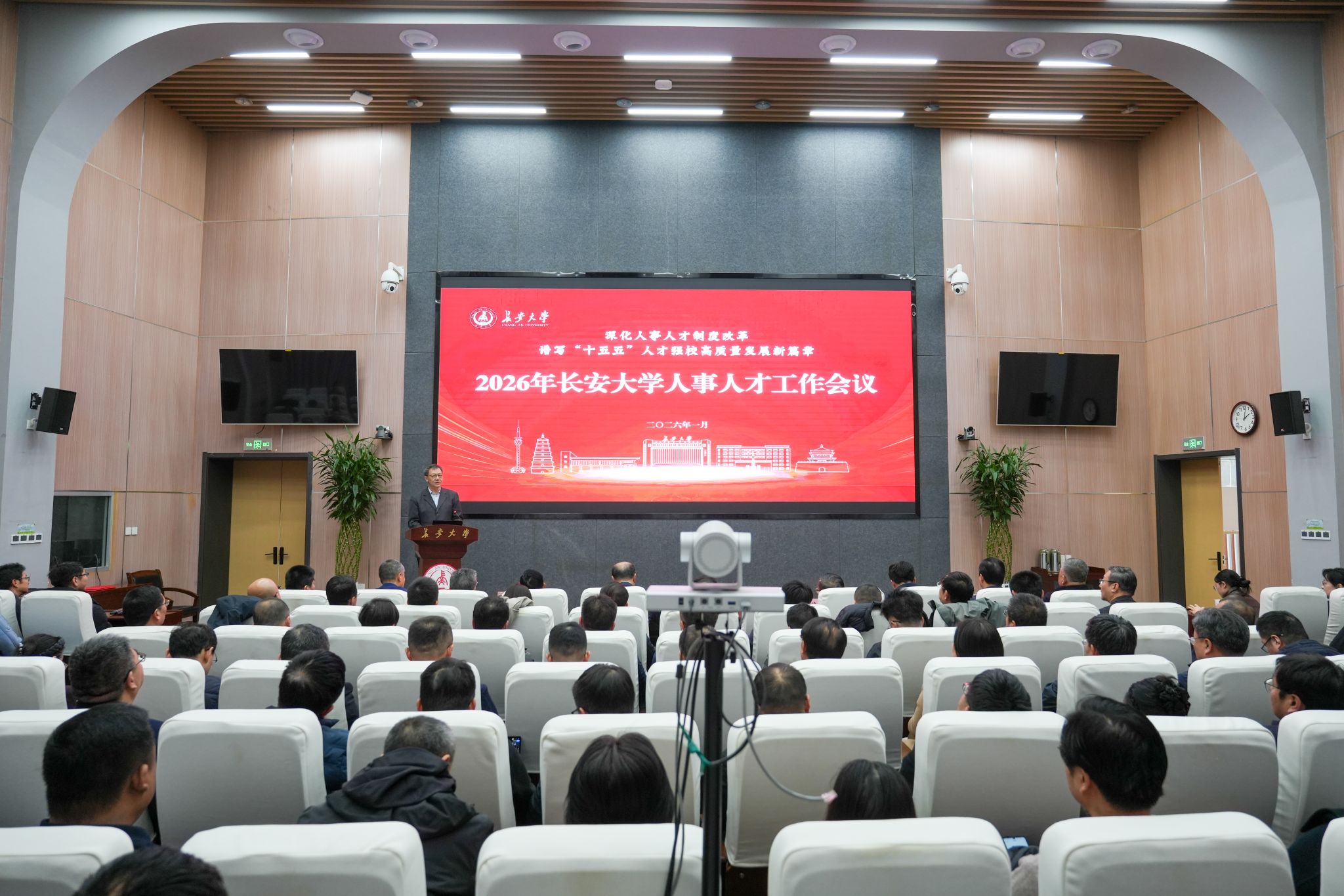 1月28日,学校在北校区师生服务大厅第二报告厅召开“深化人事人才制度改革,谱写‘十五五’人才强校高质量发展新篇章”人事人才工作大会,总结“十四五”时期人事人才工作经验成效、部署“十五五”时期人事人才工作任务,为学校高质量发展凝聚人才力量。全体在校校领导,特邀高校代表——西北工业大学人力资源部部长、教师工作部部长、高层次人才办主任唐玉生,学校高层次人才工作领导小组成员单位主要负责人,相关职能部门主要负责人,各学院党政主要负责人,2025年入选国家级人才计划代表,青年教师代表130余人出席大会。大会由校党委书记陈志坚主持。